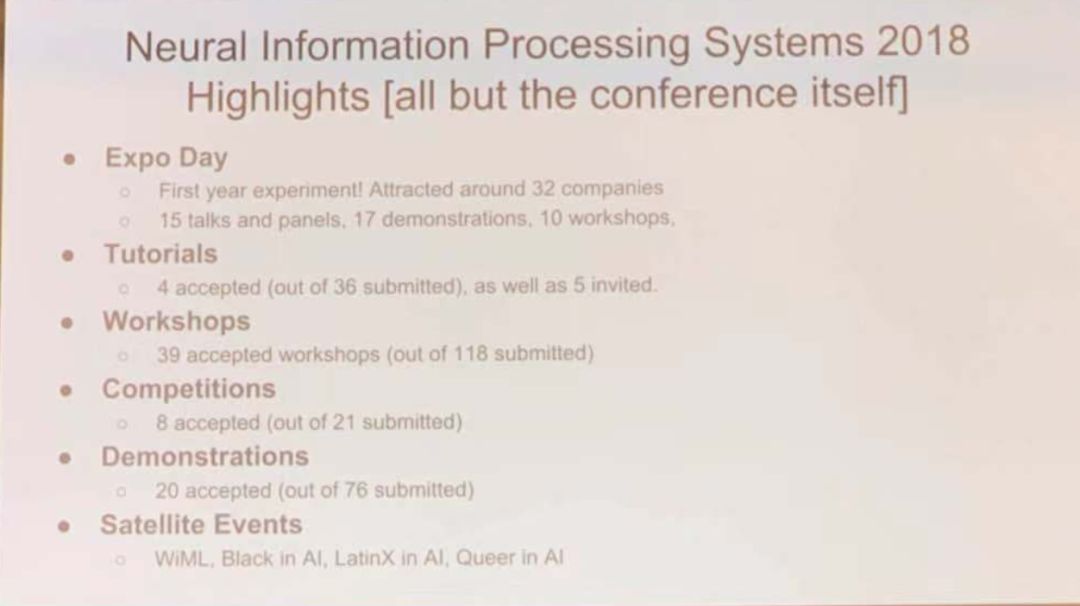 AI 科技评论消息:NeurIPS 2018 于 12 月 3 日—12 月 8 日在加拿大蒙特利尔会展中心(Palais des Congrès de Montréal)举办,今年共计有 9 场 Tutorial 、7 场主题 Talk 和 41 场 Workshop,相较去年来说,不管是主题活动,还是投稿论文,亦或是参会人数,都上了一层新的台阶。