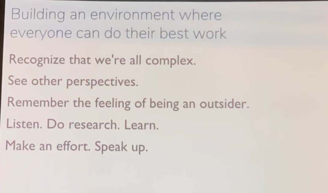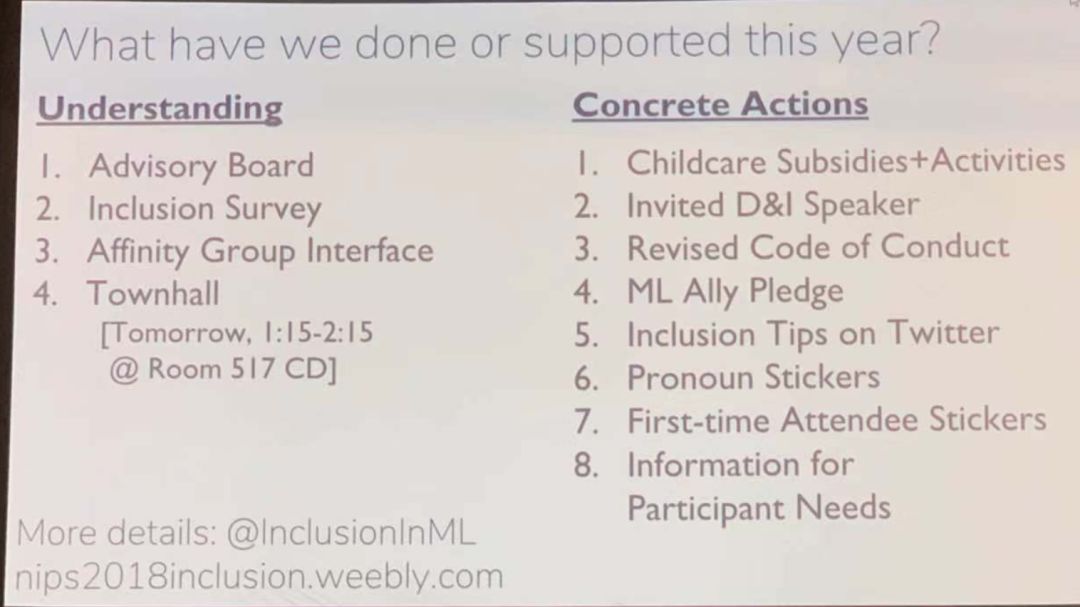为了将会议办好,组委会在今年也做出了很多努力,如设立 advisory board, inclusion survey ,邀请 D&I 讲者,在 Twitter 上提供小贴士等。