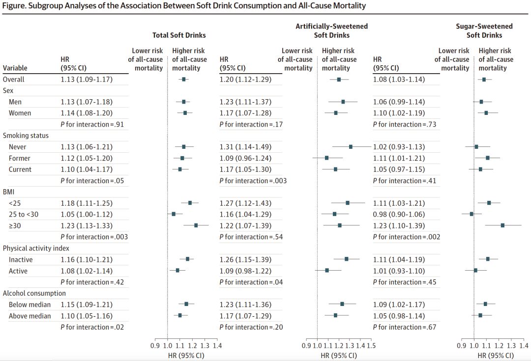 每天喝超过一杯人工甜味剂的软饮料,死亡风险仍然升高。