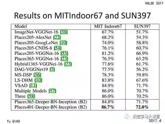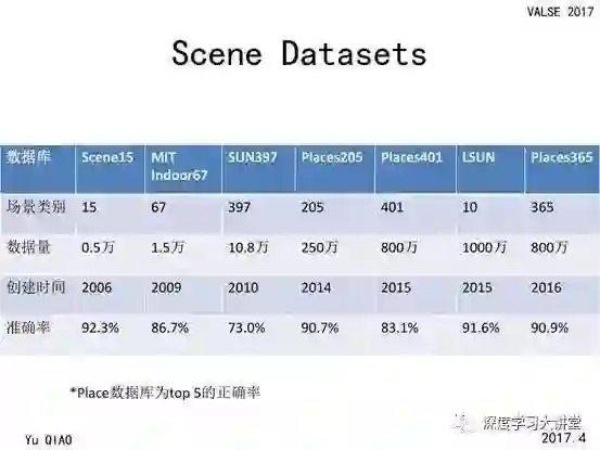 较早的是2006年的 Scene15,只有几千张图片和15个类别,之后其被扩展为 MIT Indoor 和 MIT Outdoor 这两个数据集。随着时间的发展,新的数据集也变得越来越完善,数据量可以达到千万的级别。可以看到各个大数据集的识别率还不是很高,与物体识别如ImageNet的识别率相比还存在着比较大的差距。从这个意义上讲,场景识别要比物体识别更难,其识别率还有很大的提升空间。