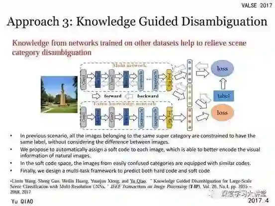 我们的第三个工作是对监督信息进行改进。我们发现相同的场景之间的差别非常大,而不同的场景之间也会具有很大的相似性,这些会对深度网络的监督学习产生干扰。但是对于人来说识别场景非常简单,这是因为人具有很多先验知识,这些知识体现在对物体的识别上。受到这种启发,我们将从其他数据集中学习到的知识迁移到场景识别这个任务中,并且得到了很好的实验结果。我们认为对于知识的使用将会对计算机视觉任务产生很有益的影响。