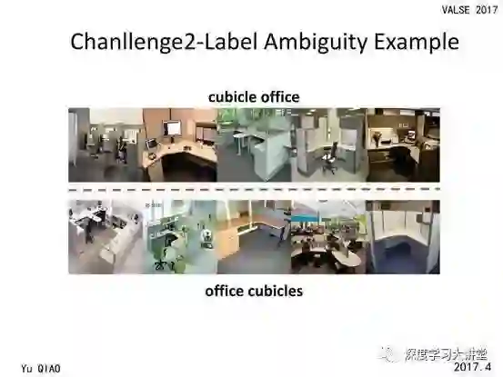 现在用的比较多的场景识别数据集是 Place,由麻省理工学院的研究组创立,并且在2015年和2016年都举行了相应的竞赛,我们团队也参加这些竞赛,并取得了较好的名次。这个数据库含有365个类别,但是每个类别具有的图片数目相差很大,共800多万张训练图片和30多万张测试图片,其数据规模是大于 ImageNet 数据集的。根据对这个数据集训练得到的模型,我们发现其与 ImageNet 数据集具有很大的差异,同时也具有很强的互补性。