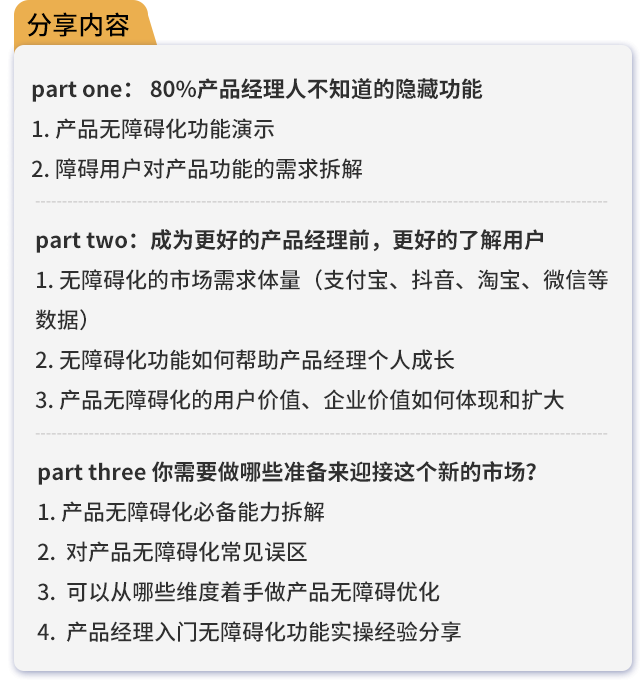 也许你对产品的无障碍设计还很陌生,本期公开课,来自信息无障碍研究会的秘书长@杨骅,就将与你聊聊信息无障碍设计这个产品技能!
