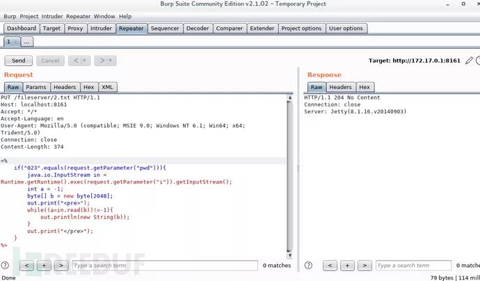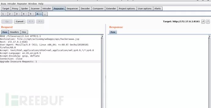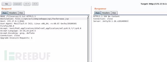由于上传的是文本文件并不能被服务器解析,所以我们下一步要利用MOVE方法将上传的webshell移动到可以执行的目录并更改后缀为jsp。