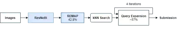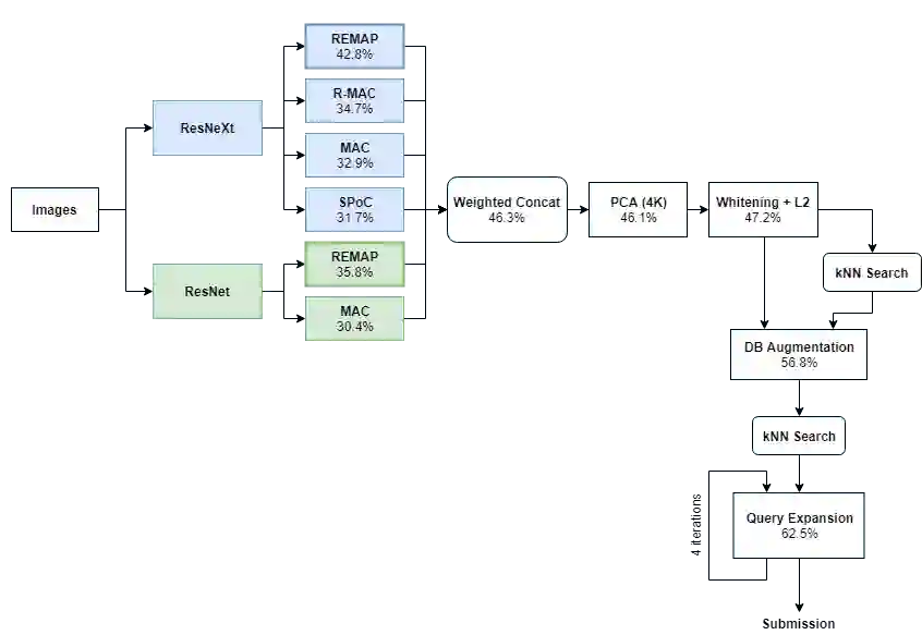 基于区域熵的多层抽象池化(REMAP)[42.8% mAP]:我们之前设计的一个全局描述符聚合了不同CNN层的深度特征,之后经过训练可以表示多个水平的可视化抽象对象。我们将在之后的CVPR研讨会上进一步展示REMAP的细节架构。