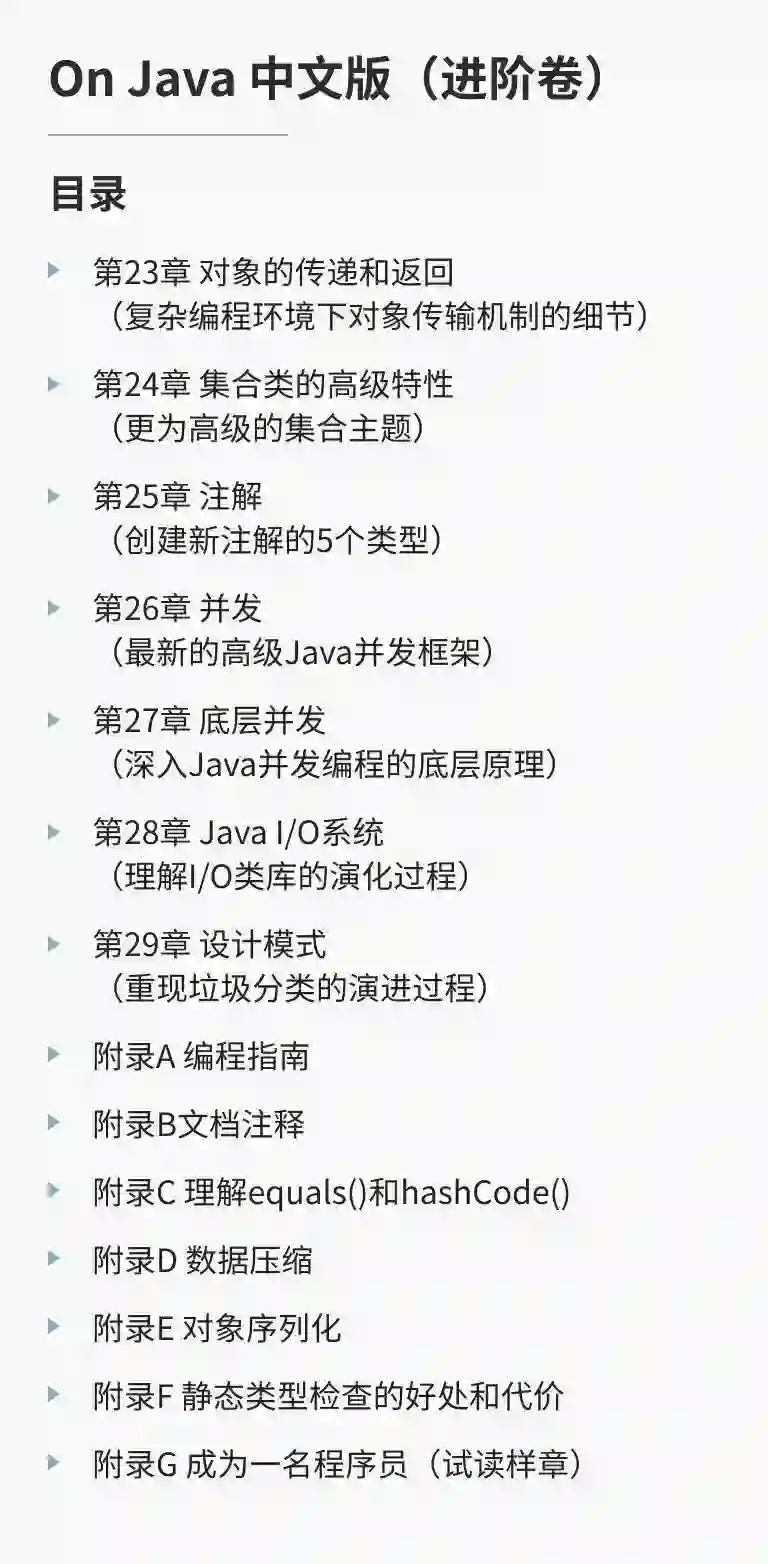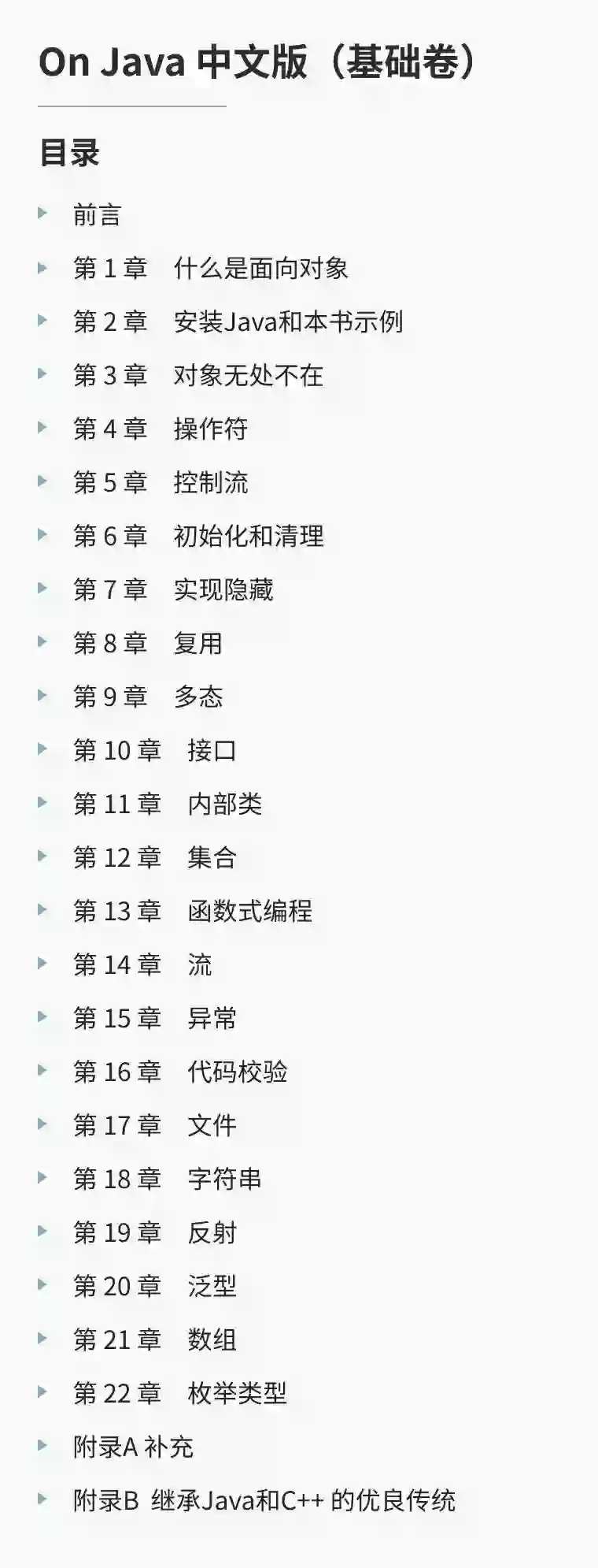 老爷子的新作《ON JAVA 中文版》,全书基于 Java8、11、17 三个长期支持版来写的。我最近抽空看了下,书里的内容包含对象、操作符、控制流、初始化和清理、复用、多态、接口、内部类、集合、函数式编程、流、异常、代码校验、文件、字符串、泛型等 Java 核心主干知识。