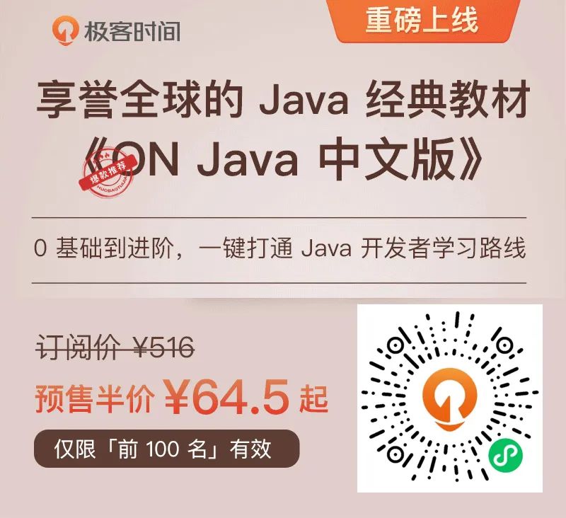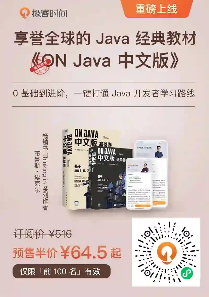 最关键的是,这套书分为基础和进阶两卷,非常适合各个层次的 Javaer 阅读,如果你是初学者那么可以先看基础卷,如果已经有多年开发经验则可以重点看进阶卷。前两天极客时间的运营跟说我,他们从人民邮电出版社,给大家申请到了一波 Bruce Eckel 大神新书《ON Java 中文版》的预售特惠,原价 ¥259.6,现在特惠两本到手半价,仅 ¥128,单本 ¥64.5,相当于每本 5 折就可以拥有了。