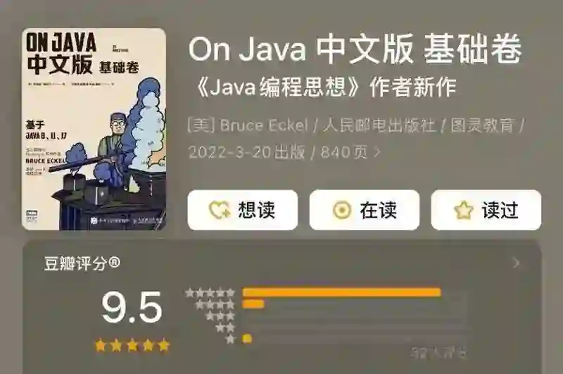 好在 Java 8 发布之后,《Java 编程思想》的作者 Bruce 大神时隔 15 年,再次聚焦 Java ,重新提笔,一气呵成,完成了他的新作《On Java》,重讲 Java 编程思想,主要是基于 Java8 的特性进行教学,同时也有 Java11、17 等版本的新特性,在豆瓣评分更是到了 9.5 的高分。