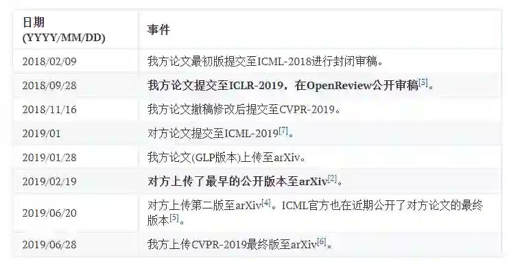 · 对方论文共有两个公开版本。其最早的版本于2019年2月19日上传至arXiv[2]。在论文被ICML-2019接收后,对方于同年6月20日在arXiv更新了其最终版[4]。ICML官方网站上的版本[5]公布时间不详,但应该是在2019年6月ICML会议结束之后。对方提交至ICML的初稿的完成时间应在2019年1月[6]。