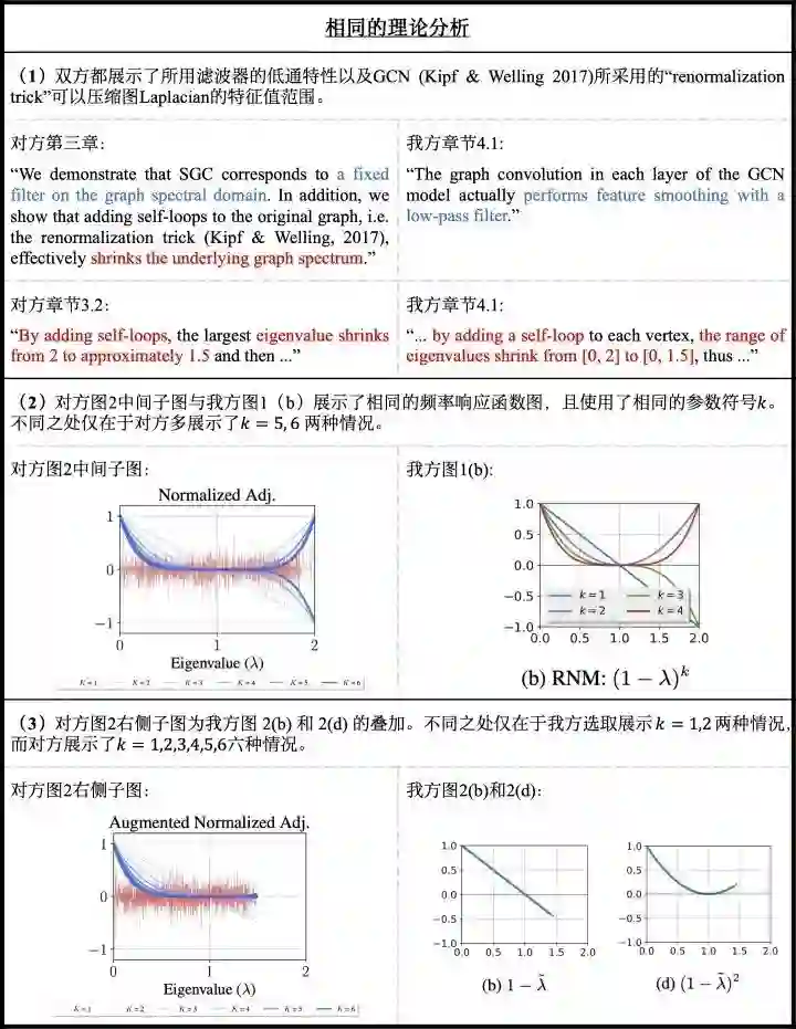 1.对方论文在其最初的公开版本中[2]并未引用我方论文。2019年3月在发现对方在arXiv的公开版本后,我方震惊于对方论文与我方论文的相似程度,曾向ICML-2019程序主席发邮件反映,但并未收到任何回复。在对方论文被ICML-2019接收后,我方曾发邮件跟对方论文作者沟通,希望对方能引用我们的工作,并对比两篇文章的区别,给予我方应有的credit。对方回复说他们的工作是独立做出,并同意引用我方论文。在2019年6月ICML会议结束之后,对方才在arXiv更新了论文第二版也是最终版[5]并在相关工作部分(第四章)简要提及我方论文:“Li et al.(2019) propose a generalized version of label propagation and provide a similar spectral analysis of the renormalization trick.”