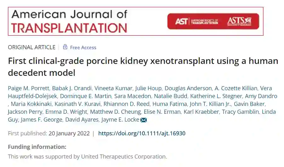近日,阿拉巴马大学伯明翰分校 Heersink 医学院移植外科教授 Jayme Locke博士带领的研究团队同样完成了一例猪肾脏移植术,将经过基因编辑的猪肾脏移植到了一例 57 岁脑死亡男性体内,并发布了首个经过同行评审的猪肾脏移植论文,公布了异种肾脏移植的更多细节。 该研究以“First clinical-grade porcine kidney xenotransplant using a human decedent model”为题,发表在 American Journal of Transplantation 杂志上。
