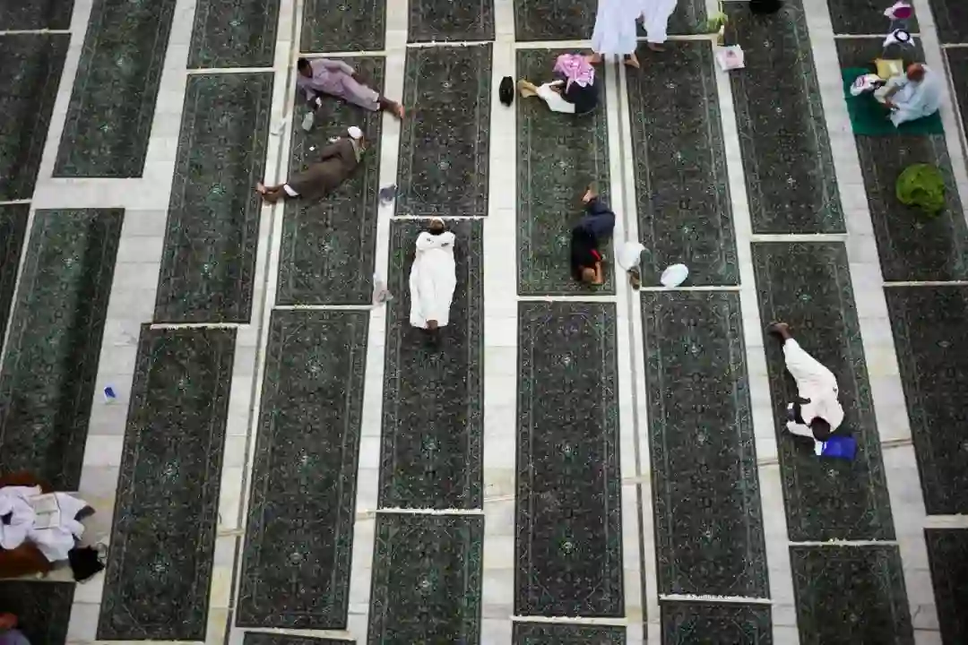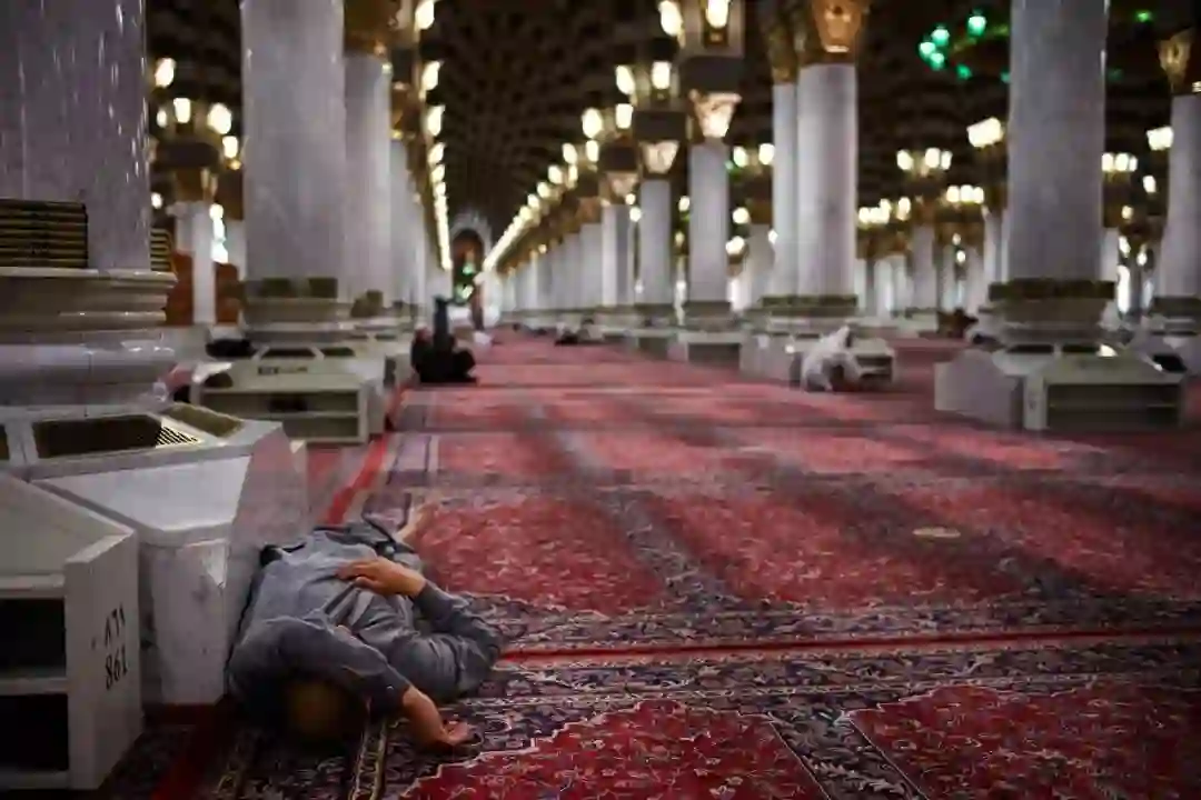 一个凌晨,躺卧在麦加禁寺之内的穆斯林信众。这座24小时开放的清真寺永远处于人头攒动的状态。