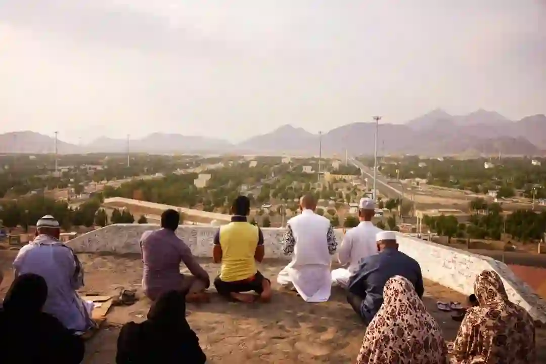 日落前后,阿拉法特山之间依然有为数众多的信众在举行祷告。