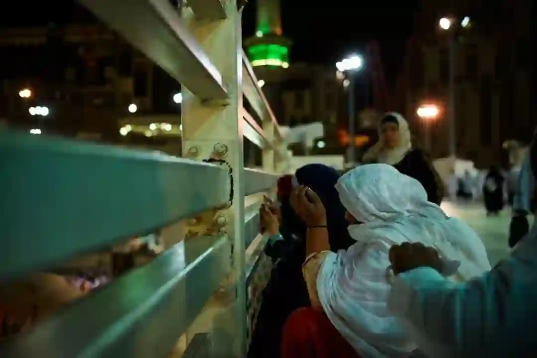 深夜,从禁寺最外侧的栏杆后方朝拜克尔白的穆斯林妇女。