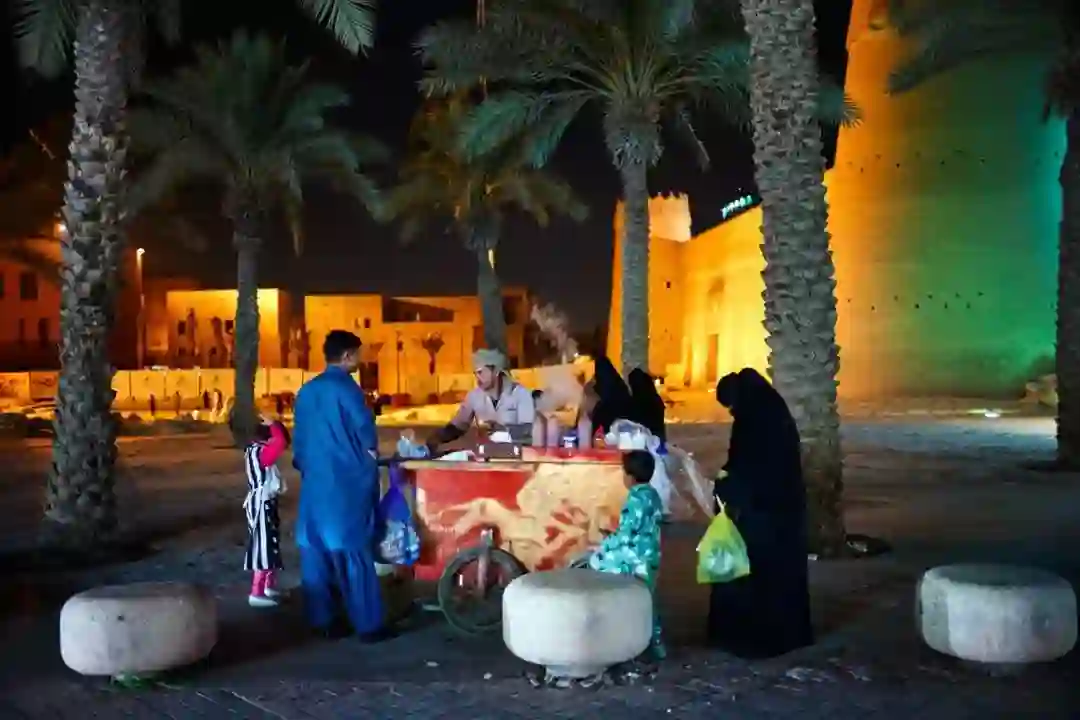 在马斯马克要塞前的棕榈树下,一户举家出游的当地人家庭正从推车小贩手中购买三明治。
