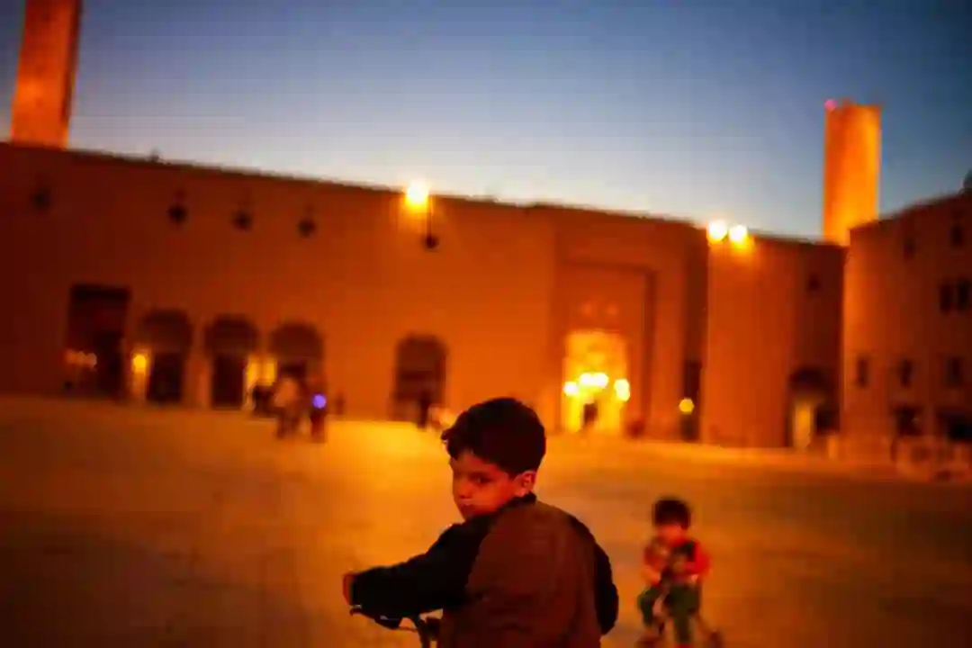 邻近马斯马克要塞的旧司法部大楼如今已被改建成可容纳1.7万人的伊玛目图尔基·本·阿卜杜拉清真寺,两名当地儿童正从清真寺的侧门后方向我们打招呼。