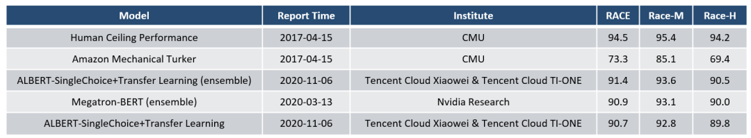 从语义识别和理解方面来看,腾讯云小微基于此流程训练出的 CXW-MRC 模型在 2019 年法研杯阅读理解赛道上以 83.4 的 F1 值取得第一,超越 BERT 基线模型 6 个百分点。2020 年又更进一步,其基于 ALBERT 开发的预训练语言模型在权威阅读理解任务 benchmark 数据集 RACE 上取得了 91.4% (集成模型) 和 90.7% (单模型) 的高准确率,分列排行榜第一和第三名,整体表现均优于英伟达的 Megatron-BERT 和谷歌的 ALBERT,非常接近人类表现参照的准确率 (94.5%)。
