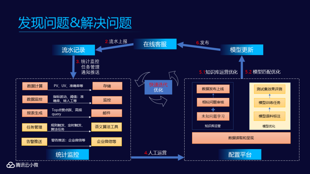 没有任何一项技术是完美的,智能客服目前的主要技术解决方案是基于深度学习的预训练语言模型框架 + 特定领域数据的模型微调 (finetune) 和迁移学习。基于对数据的逻辑分析,智能 agent 是具备一定程度的自我学习能力的。在智能客服 系统的使用过程中,人工运营、统计监控以及配置平台缺一不可,它们共同组成了一个发现并解决问题的流程(参见下图),从而推动模型自主学习,快速迭代优化,以适应数字化时代的商业发展需求。