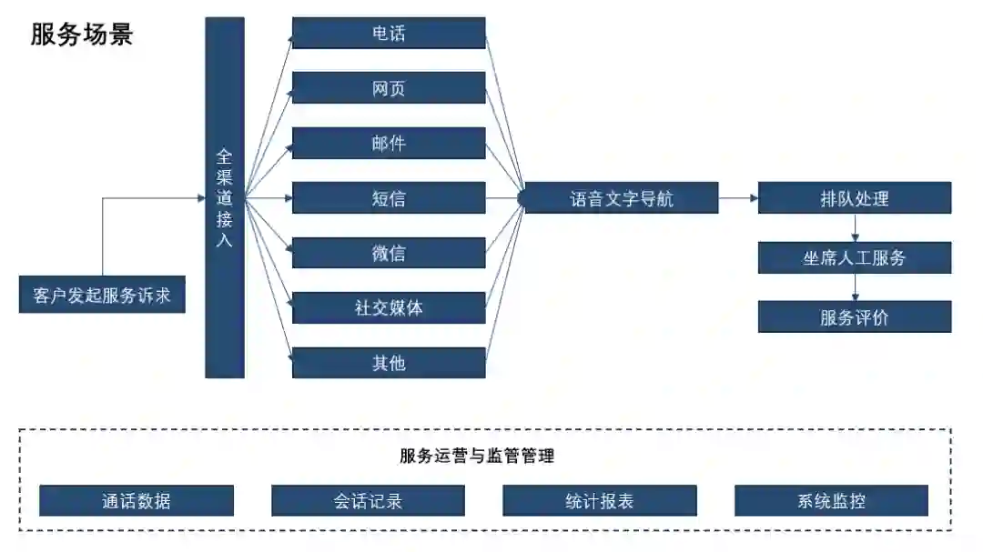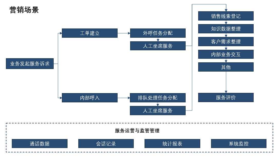 智能客服是为了克服传统客服中心存在的痛点而出现的。下面两幅图展示了传统客服中心的服务场景和营销场景客服流程。服务场景的一般流程是在渠道用户接入后,进行客户资料检索、工单生成、排队处理、线路分配等多个环节,还要配套通话数据储存、会话记录监控、周期性报表制作以及系统数据监控等多项操作。营销场景的流程一般都会从业务工单与需求出发建立呼出任务,并涵盖批量外呼、客户资料与销售线索整理、知识库建立、坐席转接等多个环节。
