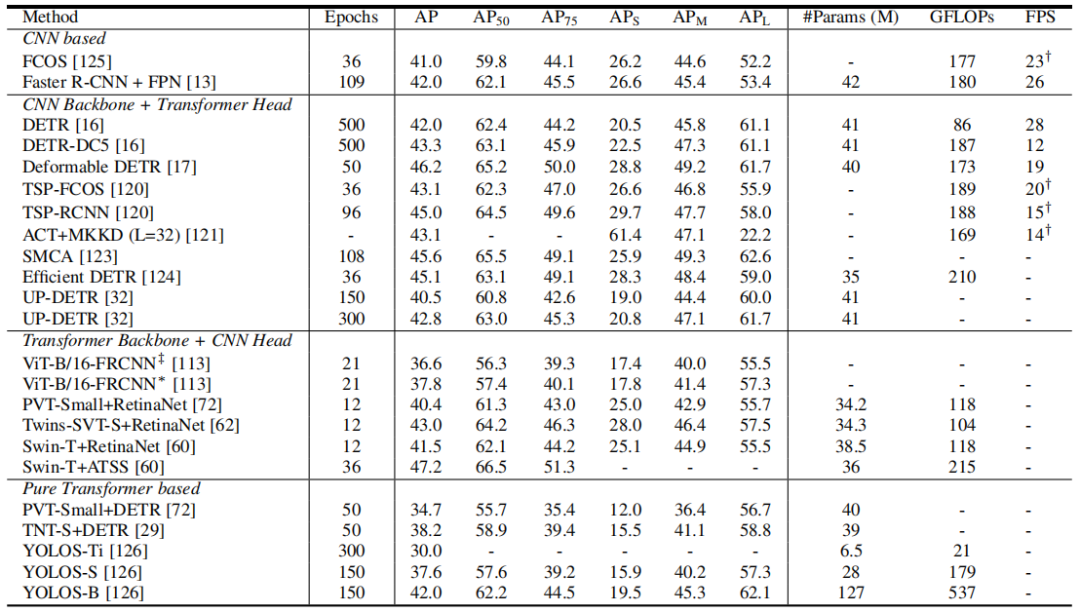 基于 Transformer 的目标检测方法也引起了广泛的兴趣,这些方法大致可以分为两类:基于 Transformer 的检测集合预测方法和基于 Transformer 骨干网络的检测方法。与基于 CNN 的检测器相比,基于 Transformer 的方法在准确性和运行速度方面都表现出了强大的性能。表 3 展示了在 COCO 数据集上基于 Transformer 的不同目标检测器的性能。