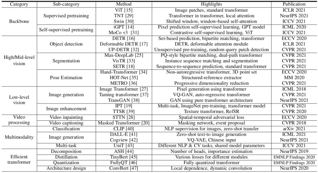 按照视觉 Transformer 的设计和应用场景,本文对视觉 Transformer 模型进行了系统性的归类,如表 1 所示:骨干网络、高 / 中层视觉、底层视觉、多模态等,并且在每一章中针对任务特点进行详细分析和对比;