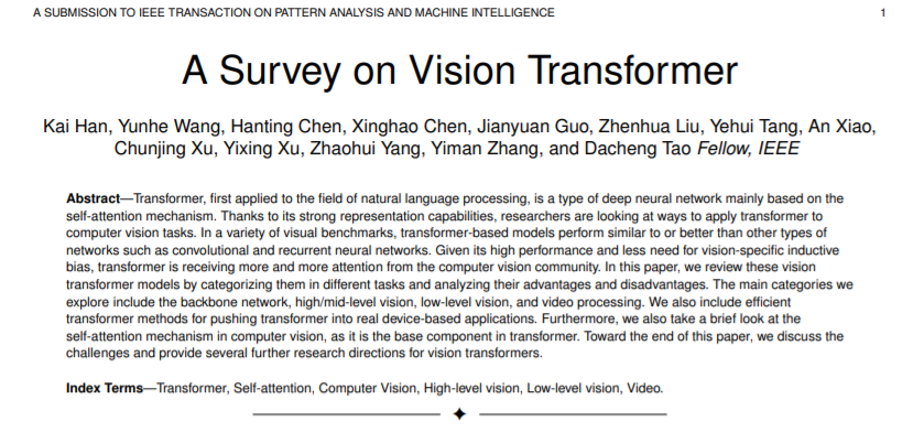 华为诺亚方舟实验室联合北大和悉大整理了业界第一篇视觉Transformer综述。