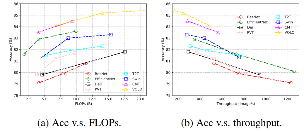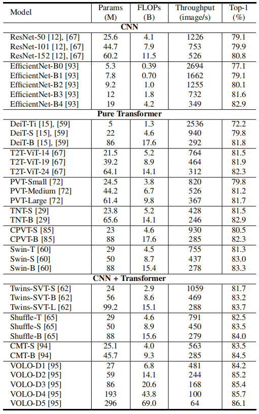 图 2 代表性 CNN 和 Transformer 网络的 FLOPs / 吞吐量对比