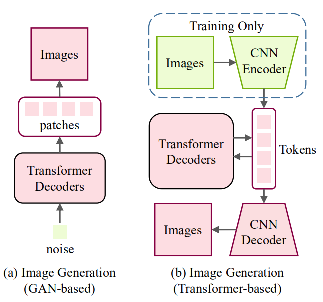 底层视觉是计算机视觉领域的一个重要问题,如图像超分辨率和图像生成等,而目前也有一些工作来研究如何将 Transformer 应用于底层视觉中来。这些任务通常将图像作为输出(高分辨率或去噪图像),这比分类、分割和检测等高层视觉任务(输出是标签或框)更具挑战性。图 3 和图 4 展示了在底层视觉中使用 Transformer 的方式。在图像处理任务中,首先将图像编码为一系列 token,Transformer 编码器使用该序列作为输入,进而用 Transformer 解码器生成所需图像。在图像生成任务中,基于 GAN 的模型直接学习解码器生成的 token,通过线性映射输出图像,而基于 Transformer 的模型训练自编码器学习图像的码本,并使用自回归 Transformer 模型预测编码的 token。而一个有意义的未来研究方向是为不同的图像处理任务设计合适的网络架构。