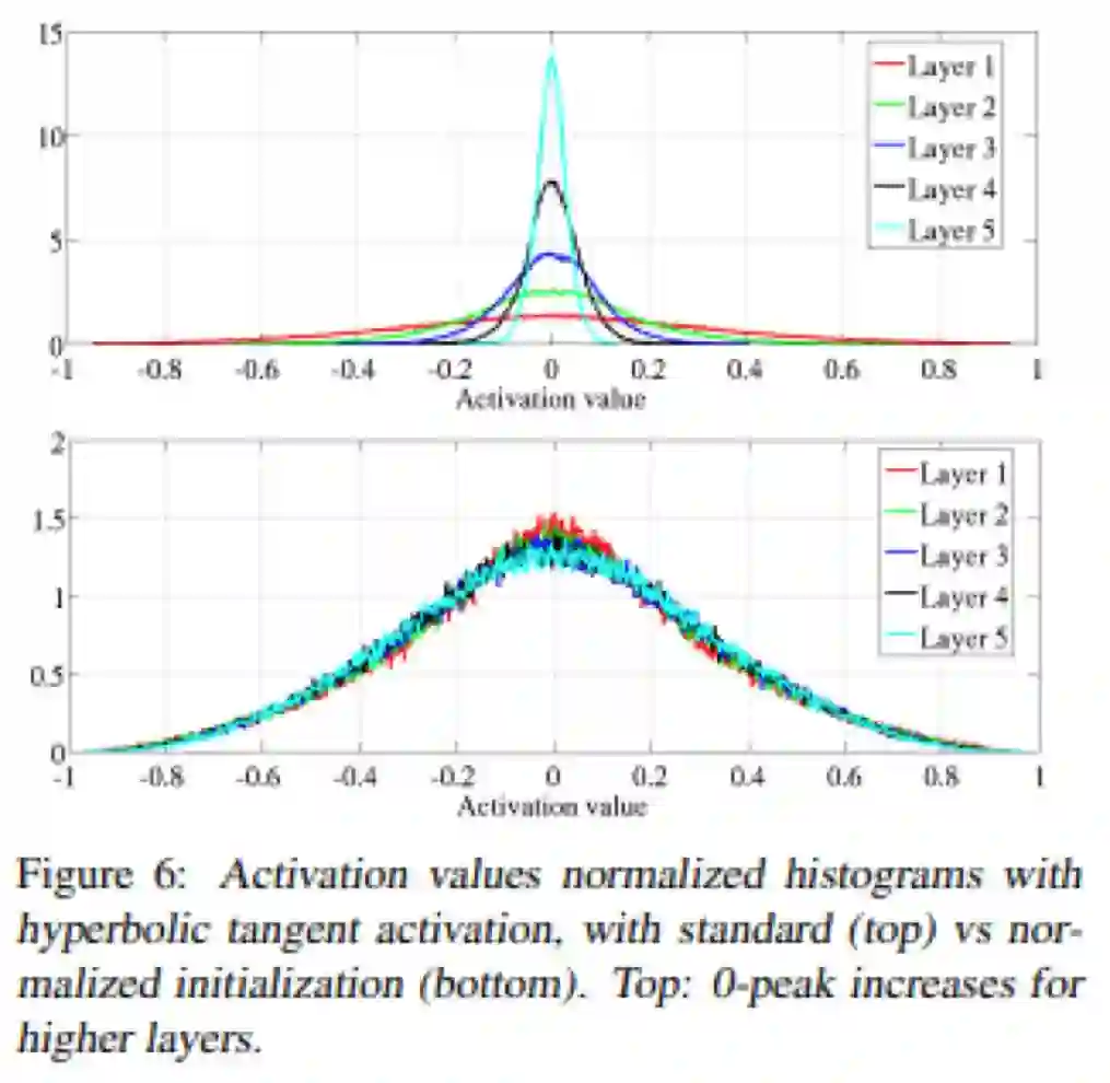 本文探讨了深度网络的一些问题,特别是权值的初始随机化。本文还注意到了S型曲线和双曲正切激活问题,并提出了替代方案SoftSign,它是一种具有更加平滑的渐近线的S型激活函数。但是,本文最主要的贡献在于初始化。当使用正态分布的权重进行初始化时,数值很可能会急剧增大或者减小,从而无法进行训练。假设前一层的值是正态分布的独立同分布,则将它们相加会增大其方差,因此应按输入数量成比例地缩小方差,以保持输出值服从标准正态分布。将这个逻辑反过来(即按输出数量进行处理)则可以处理梯度的问题。本文介绍的Xavier初始化是两者之间的折衷,是利用方差为
