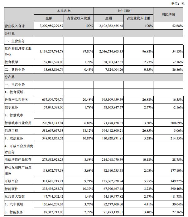 8月14日,科大讯飞最新公布的2018年半年度报告显示,科大讯飞实现营业收入32.10亿元,与2017年同期的21.02亿元相比,增长52.68%;其中,政法业务收入3.49亿元,占营收比重为10.87%。
