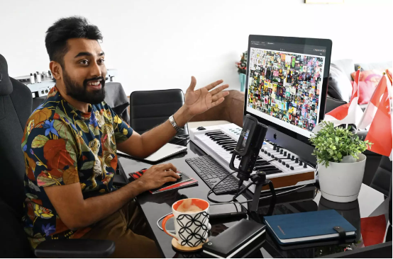 区块链企业家 Vignesh Sundaresan,又名 MetaKovan,在他新加坡的家中。他展示的 NFT 作品“Everydays: The First 5000 Days”由艺术家 Beeple 创作完成。2021 年 3 月,Sundaresan 以 6930 万美元天价买下了该 NFT。