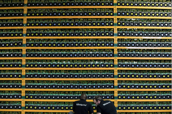 2018 年,两位技术人员正在魁北克圣亚森特的 Bitfarms 服务器农场检查比特币采矿情况。