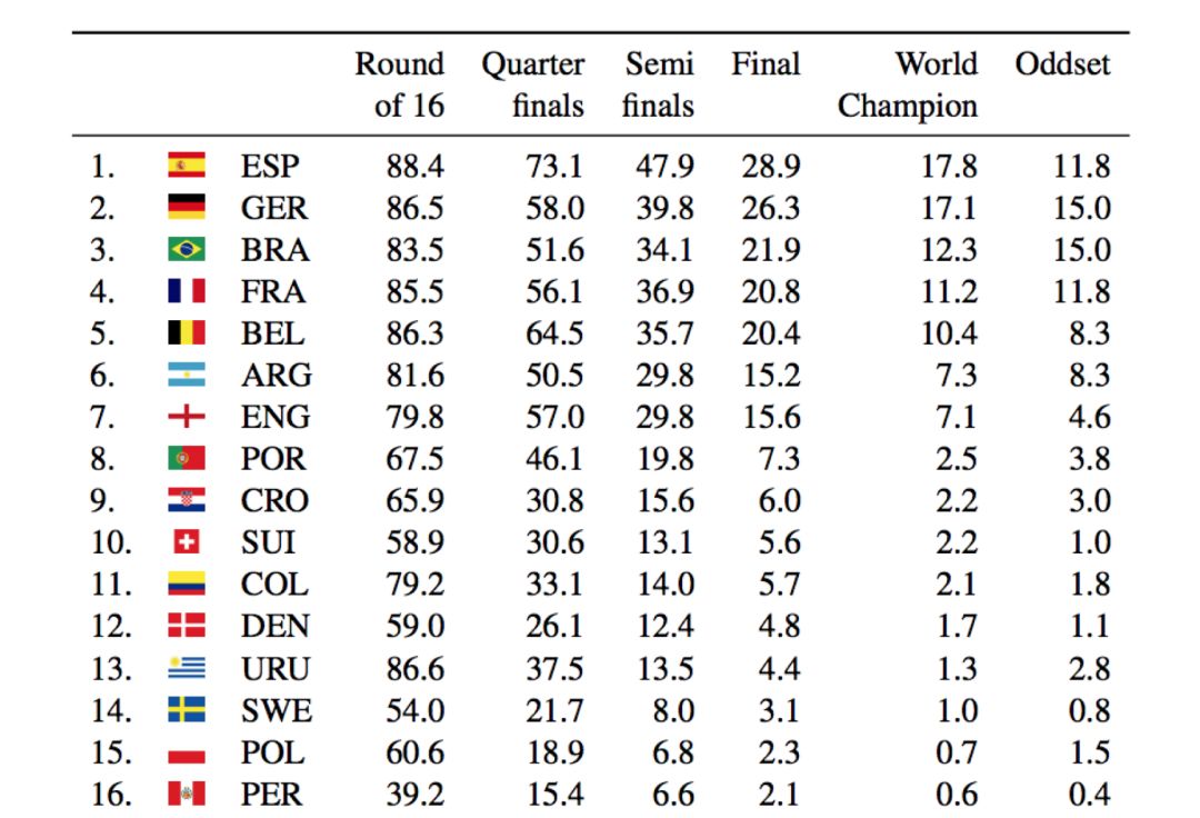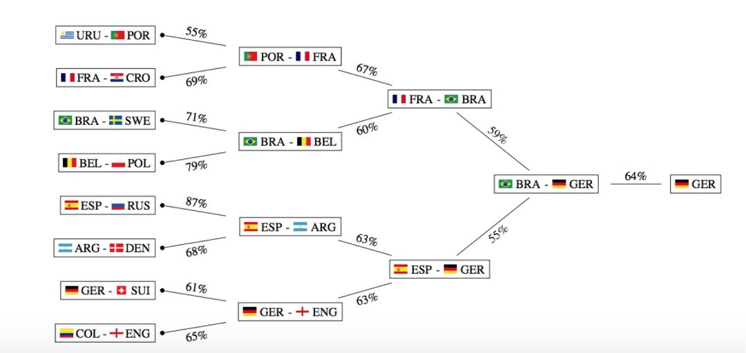 他们的算法模型预测,在小组赛还未开始时,最有可能夺冠的球队为西班牙、德国、和巴西,但当团队对比赛进行了 10 万次模拟后,发现如果德国和西班牙挺进四分之一决赛,则两者夺冠的胜率就会持平。但世事难料,他们的机器学习算法显然不会料到西班牙会在首战失利后更换主教练。