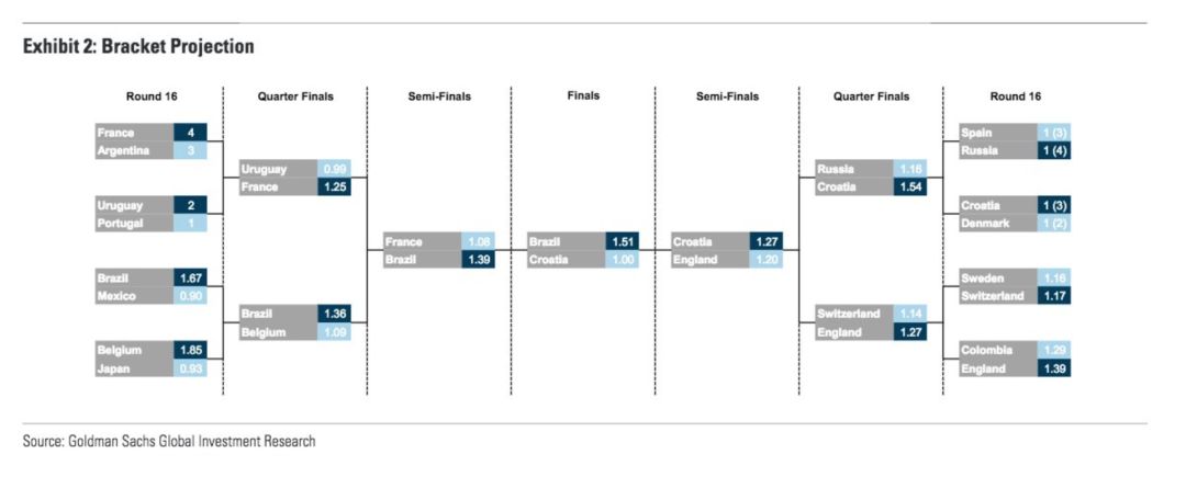 高盛预测,巴西将赢得世界杯冠军,在决赛中以 1.70 比 1.41 的赔率击败德国队,而四分之一决赛将在法国和西班牙、巴西和比利时、葡萄牙和阿根廷、德国和英格兰之间进行。好吧,就只预测对了巴西和比利时这一场。