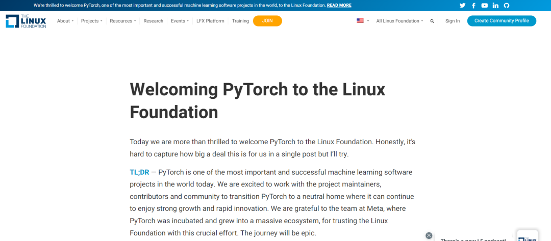 PyTorch 是当今世界上最重要和最成功的机器学习软件项目之一。我们很高兴与项目维护者、贡献者和社区合作,将 PyTorch 带入到一个中立的“家园”,在那里它可以继续强劲地增长并快速地创新。我们感谢 Meta 团队孵化出了 PyTorch 并让它成长为一个庞大的生态系统,更要感谢 Meta 团队对于 Linux 基金会的信任,正因为有了这样的信任才让 PyTorch 加入 Linux 成为可能,才让这场史诗般的旅程得以呈现。