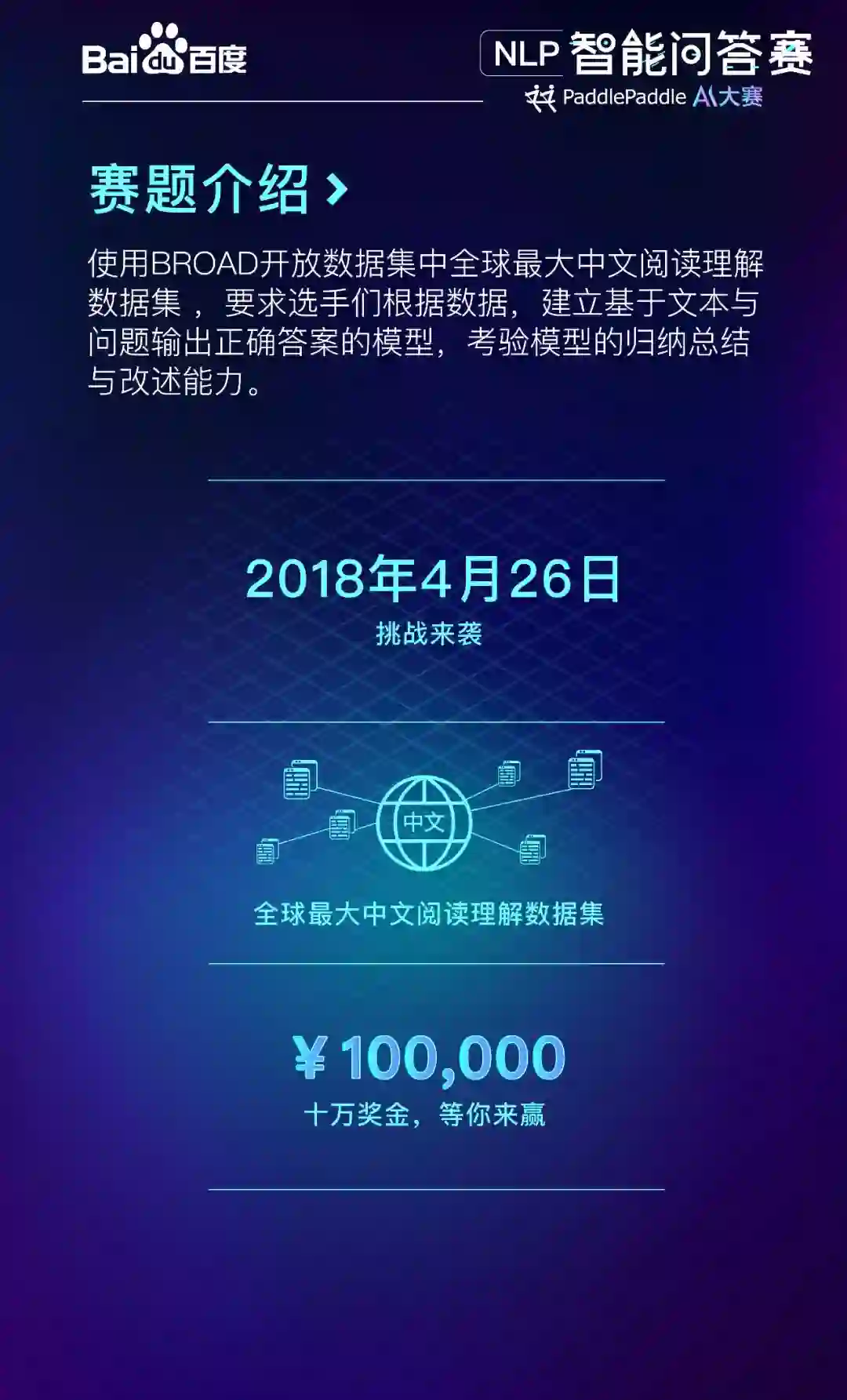 这次上线的NLP智能问答赛事则要挑战人工智能领域里的难题——阅读理解。