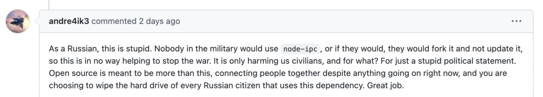 还有人表示,「有人用行动表明开源是有国界的。供应链污染并非良策。」