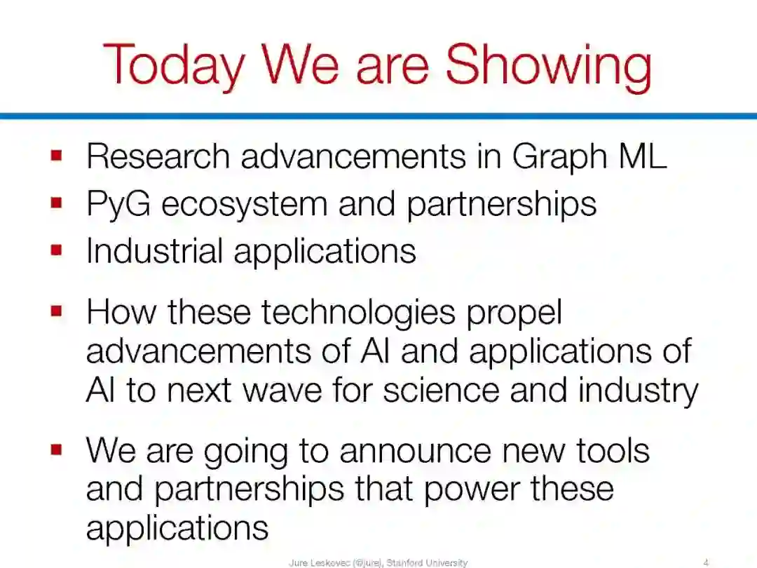 在斯坦福图学习研讨会上,我们将汇集来自学术界和工业界的思想领袖,展示图神经网络最前沿和最新的方法进展。研讨会将展示领先的图机器学习框架的新发展,以及不同领域的广泛的图机器学习应用。此外,研讨会还将讨论大规模训练和部署基于图的机器学习模型的实际挑战。