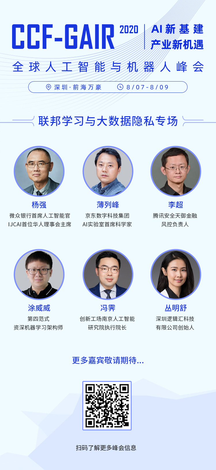 在 AI 研究上,因为中国的起步比国外晚了那么十年,多少奠定下了我国研究机构和企业处于跟随状态的基调。然而在联邦学习的研究上,并非如此。我国不仅不再处于跟随状态,而且可以说走在国际联邦学习的技术研究、标准制定以及应用落地实践的前头。在国内,除了微众银行,还有其他企业在齐头并进地耕耘这一研究方向。正如在《中国联邦学习「五大流派」》一文中总结地那样,国内目前已主要形成联邦学习、共享智能(蚂蚁金服)、知识联邦(平安科技)、联邦智能(同盾科技)和异步联邦学习(京东数科)这五大流派。在应用方面,国内已有多家企业退出了可以进行产业落地应用的开源框架,首个便是微众银行早在2018年就开始研发、于2019年初正式开源的全球首个工业级联邦学习框架 FATE(Federated Learning Enabler)。后有百度推出PaddleFL联合学习框架聚焦深度学习在CV、NLP、推荐算法等领域的联邦学习应用、平安科技自主研发的蜂巢联邦学习平台对准金融场景中多方信息的安全协作计算、腾讯云开发出的“腾讯云数盾”以满足数据安全治理的多重需求。在具体的落地场景上,联邦学习现已在金融信贷风控、医疗AI、安防等多个场景中初具应用规模。然而除了这些行业以外,其他行业同样普遍存在数据孤岛的问题。基于此,微众 AI 团队发起了一个旨在开发和推广安全和用户隐私保护下的 AI 技术及其应用的项目「联邦学习生态」(FedAI Ecosystem),以期建立基于联邦学习的 AI 技术生态,使得各行业更充分发挥数据价值,推动垂直领域案例落地。在联邦学习生态的加持下,未来联邦学习可能能够为各行业架起一座机构与用户、机构与机构之间数据信任的桥梁,从而实现 AI 成果普惠共享的愿景。不过在这一愿景实现之前,联邦学习的研究者们以及企业参与者们还有很多的工作要做。作为中国鲜有的拥有话语权的技术研究领域,联邦学习下一步会有哪些重点方向?在应用布局方面还要突破哪些重点挑战?如何在吸引更多国内企业加入的同时也将国外企业吸纳到生态中?2020年8月7日-9日,由中国计算机学会(CCF)主办,香港中文大学(深圳)、雷锋网联合承办的第五届CCF-GAIR全球人工智能与机器人峰会,即将在深圳召开。今年,将专设「联邦学习与大数据隐私」专场,不仅邀请了联邦学习的发起人杨强教授坐镇专场,还邀请了联邦学习国内「五大流派」之一的京东数科AI实验室首席科学家薄列峰,以及腾讯安全天御金融风控负责人李超、第四范式资深机器学习架构师涂威威、创新工场南京人工智能研究院执行院长冯霁、深圳逻辑汇科技有限公司创始人丛明舒等专家,从产学研多个视角,共同深入「拆解」联邦学习!