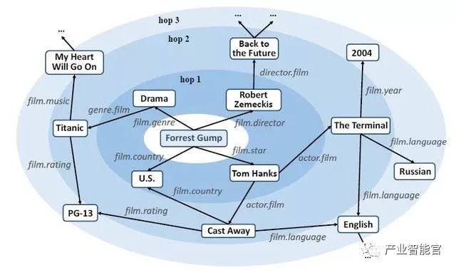 下图展示了用户兴趣在知识图谱上扩散的过程。以一个用户看过的“Forrest Gump”为中心,用户的兴趣沿着关系边可以逐跳向外扩展,并在扩展过程中兴趣强度逐渐衰减。