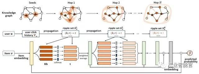 Ripple的中文翻译为“水波”,顾名思义,Ripple Network模拟了用户兴趣在知识图谱上的传播过程,整个过程类似于水波的传播: