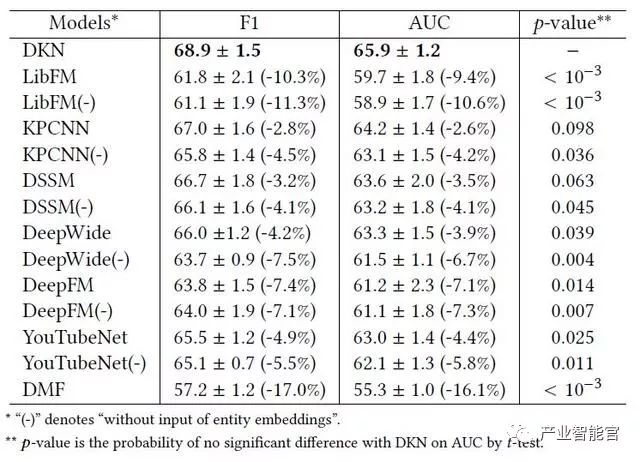 该模型在新闻推荐上取得了很好的效果:DKN取得了0.689的F1值和0.659的AUC值,并在p=0.1水平上比其它方法取得了显著的提升。