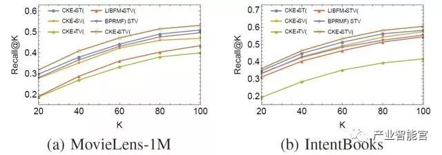 使用诸如随机梯度下降(SGD)的方法对上述损失函数进行训练,我们最终可以得到用户/物品向量,以及实体/关系向量。CKE在电影推荐和图书推荐上取得了很高的Recall值和MAP值: