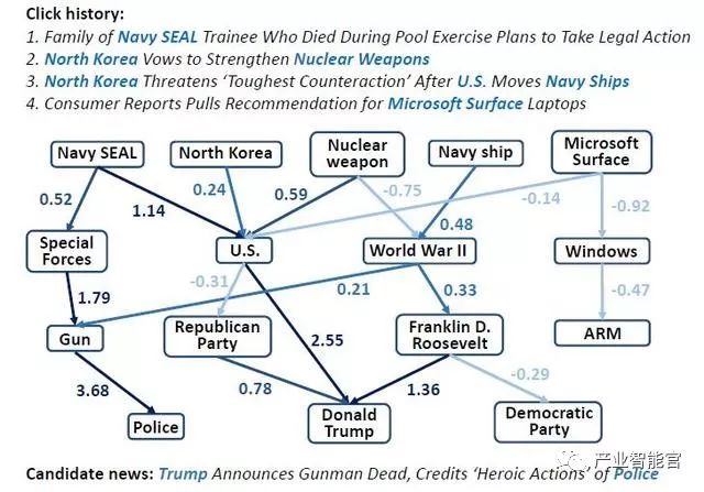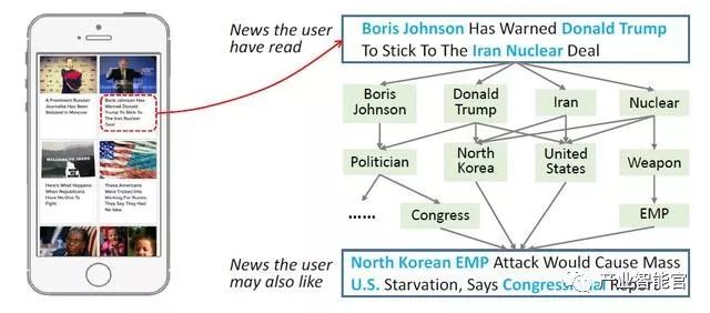 我们以新闻推荐[1]为例来介绍依次学习。如下图所示,新闻标题和正文中通常存在大量的实体,实体间的语义关系可以有效地扩展用户兴趣。然而这种语义关系难以被传统方法(话题模型、词向量)发掘。