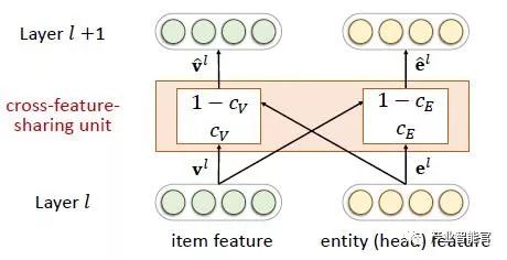 由于推荐系统中的物品和知识图谱中的实体存在重合,所以两个任务并非相互独立。我们在两个任务中设计了交叉特征共享单元(cross-feature-sharing units)作为两者的连接纽带。