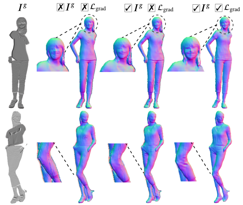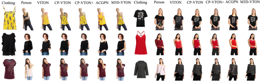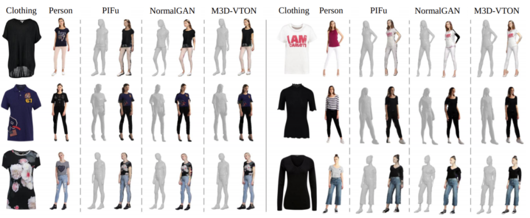 由于我们是第一个提出从单图到三维的试穿网络,所以并无可以直接比较的 3D 试穿工作,于是我们设计了二维试穿加三维人体重建的混合模型来进行比较。具体地,我们采用 CP-VTON [7] 作为二维试穿模型,将其试穿结果分别送入到 PIFu [8],NormalGAN [9] 和 Deephuman [10] 三个人体重建网络中得到相应的 3D 试穿结果。它们与 M3D-VTON 的可视化比较如图7所示: