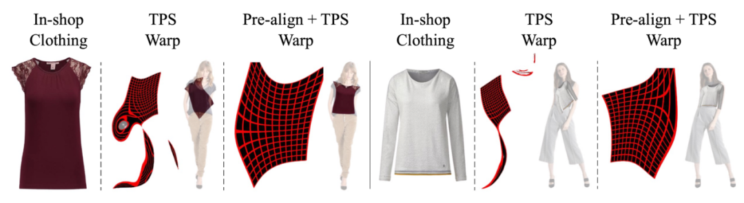 从图3可以看出,由于目标衣服和参考人物之间的尺寸相差过大,导致直接回归两者之间的 TPS 变形参数变得十分苦难,因此我们提出了一个自适应的预对齐策略来缓解 TSP 的变形压力。具体地,该策略通过 (1) 式将目标衣服