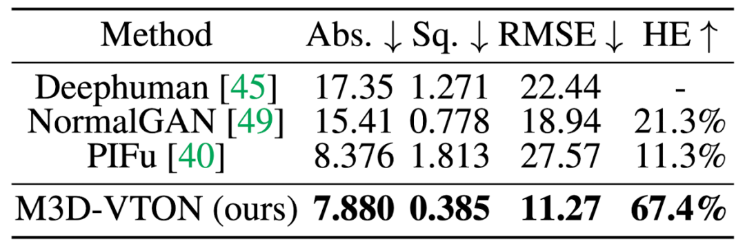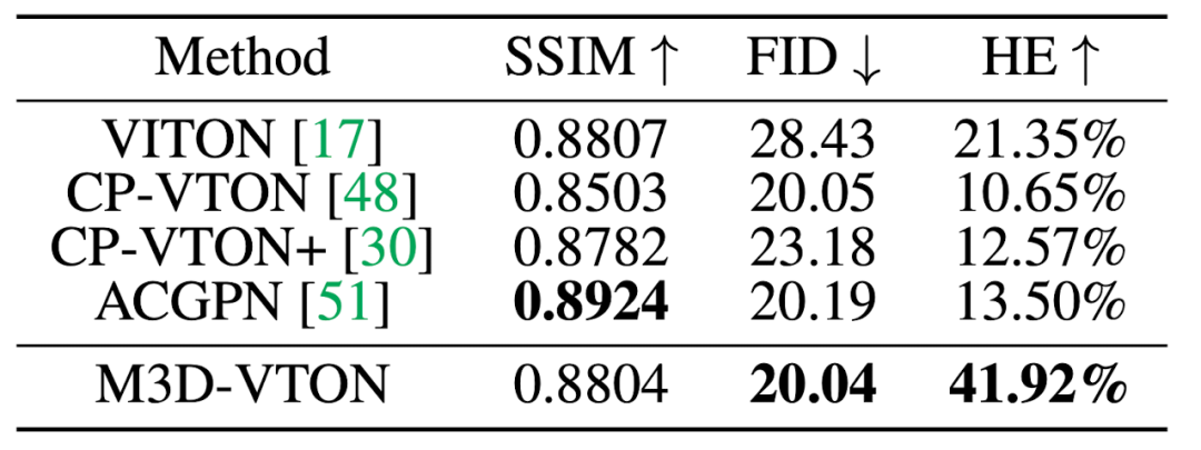表 2 M3D-VTON 与基线三维虚拟试穿方法定量比较