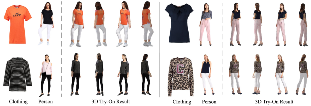 虚拟试穿是以人为中心的生成领域中十分具有商业价值的研究方向。近年来研究人员的目光已经逐渐从基于物理模拟 [1] 和动态捕捉 [2] 转向基于学习重建的三维试穿领域,即直接从多张2D图片重建3D人体从而避免昂贵的物理模拟或者三维感知设备。然而,大多数基于学习的三维试穿方法依赖于参数化的SMPL人体模型 [3] 或者一些预定义的衣服模版库 [4],限制了他们的泛化性能。而且由于参数化3D表示所带来的高计算复杂度,多数现有的3D试穿模型难以达到较快的推理用时。另一方面,基于图像的2D虚拟试穿研究因其结构简单,推理速度快并且训练集容易构建等特点而得到了更为广泛的研究。多数2D试穿工作通过TPS [5] 等非刚性形变方法实现了较高质量的平面试衣渲染结果,但遗憾的是它们忽略了潜在的3D人体信息,在最终的表现形式上也欠缺 3D 试穿的逼真视觉效果。
